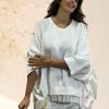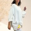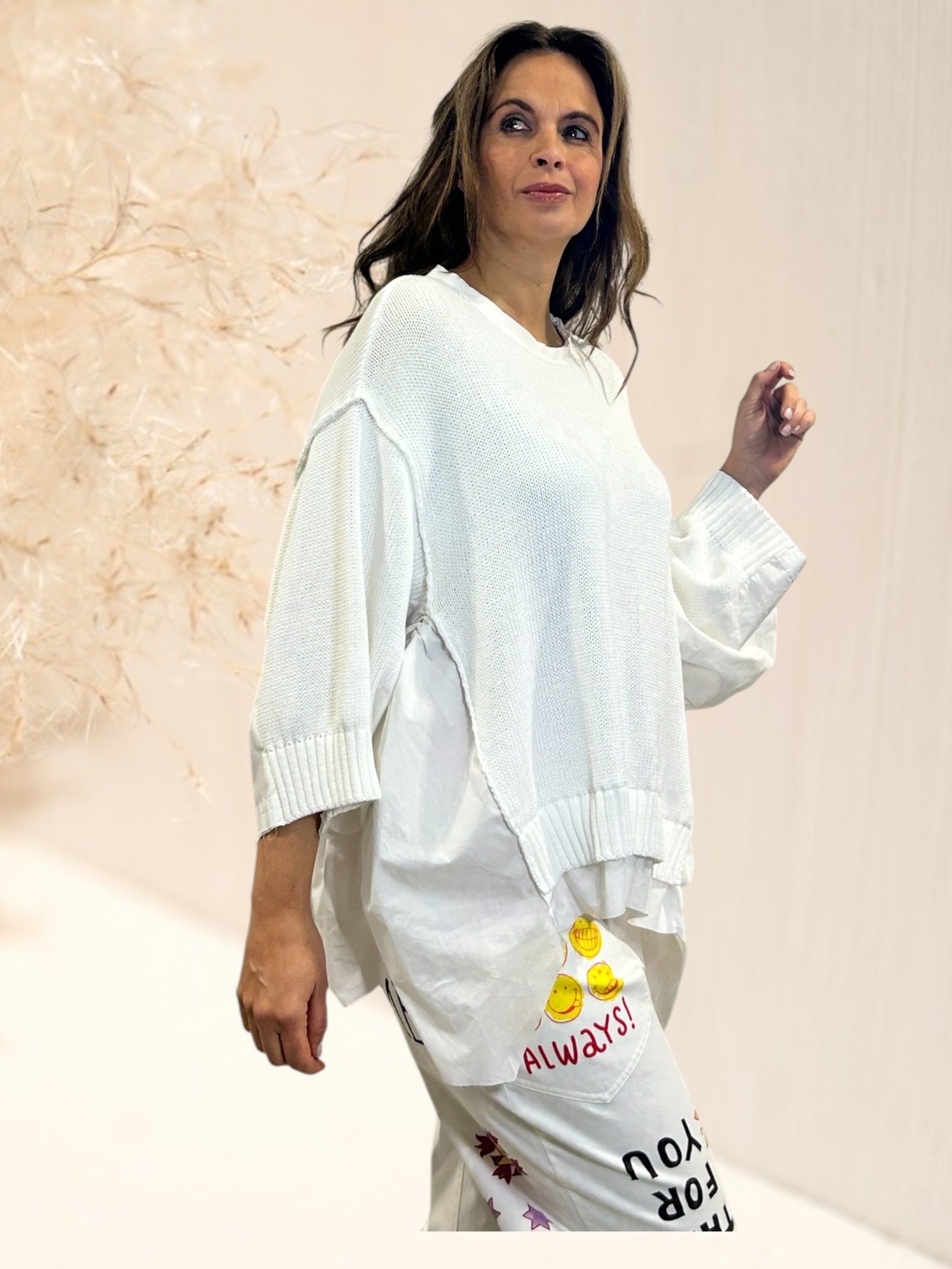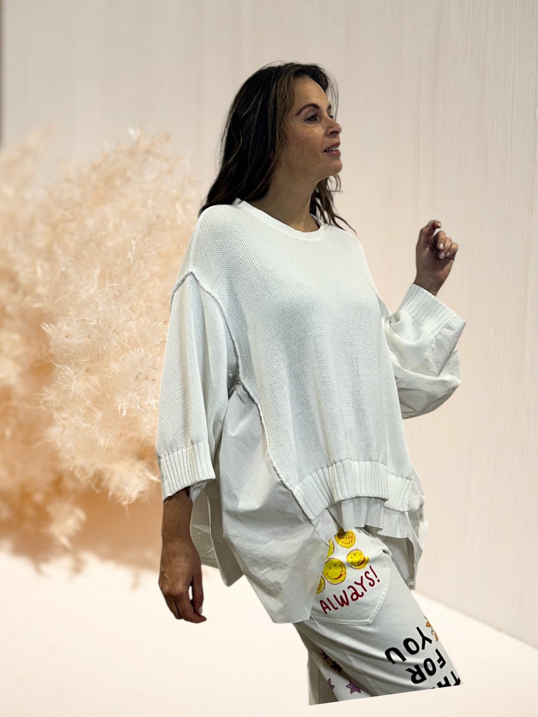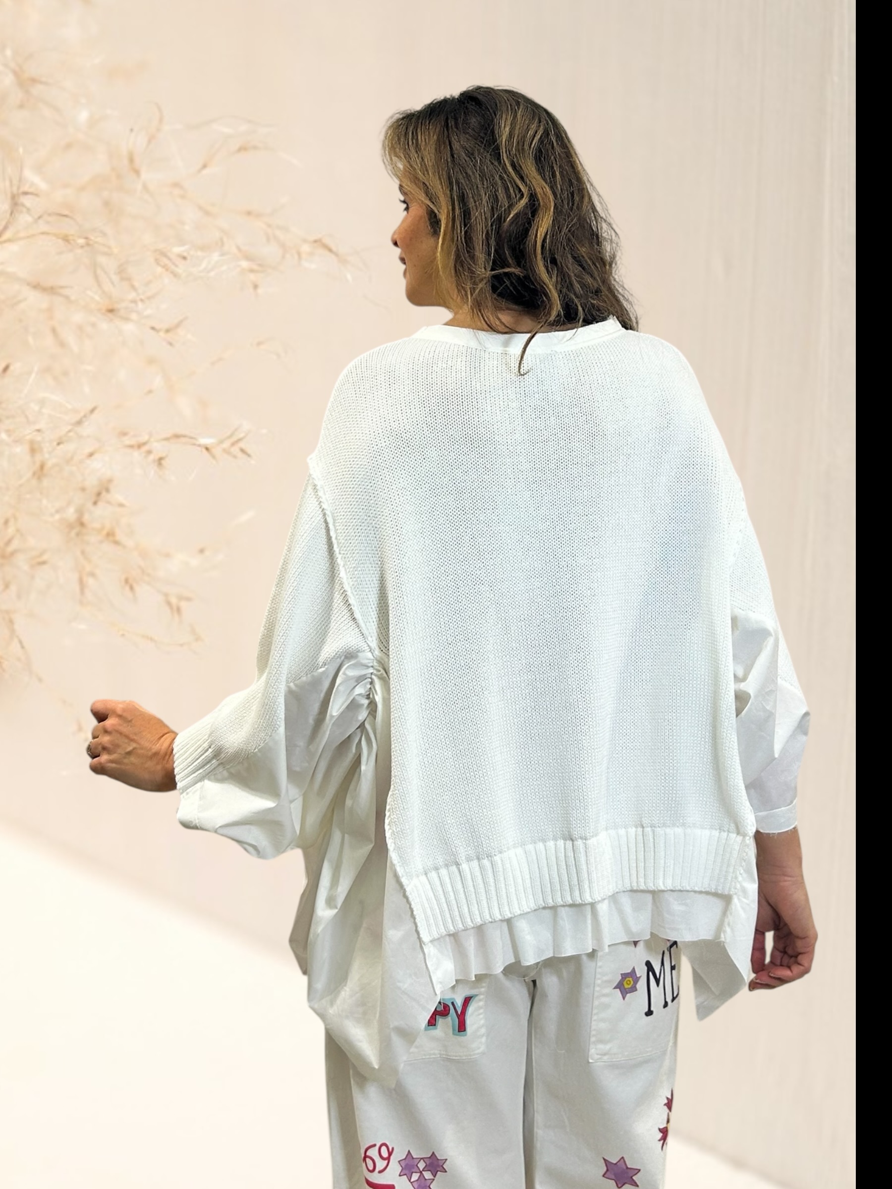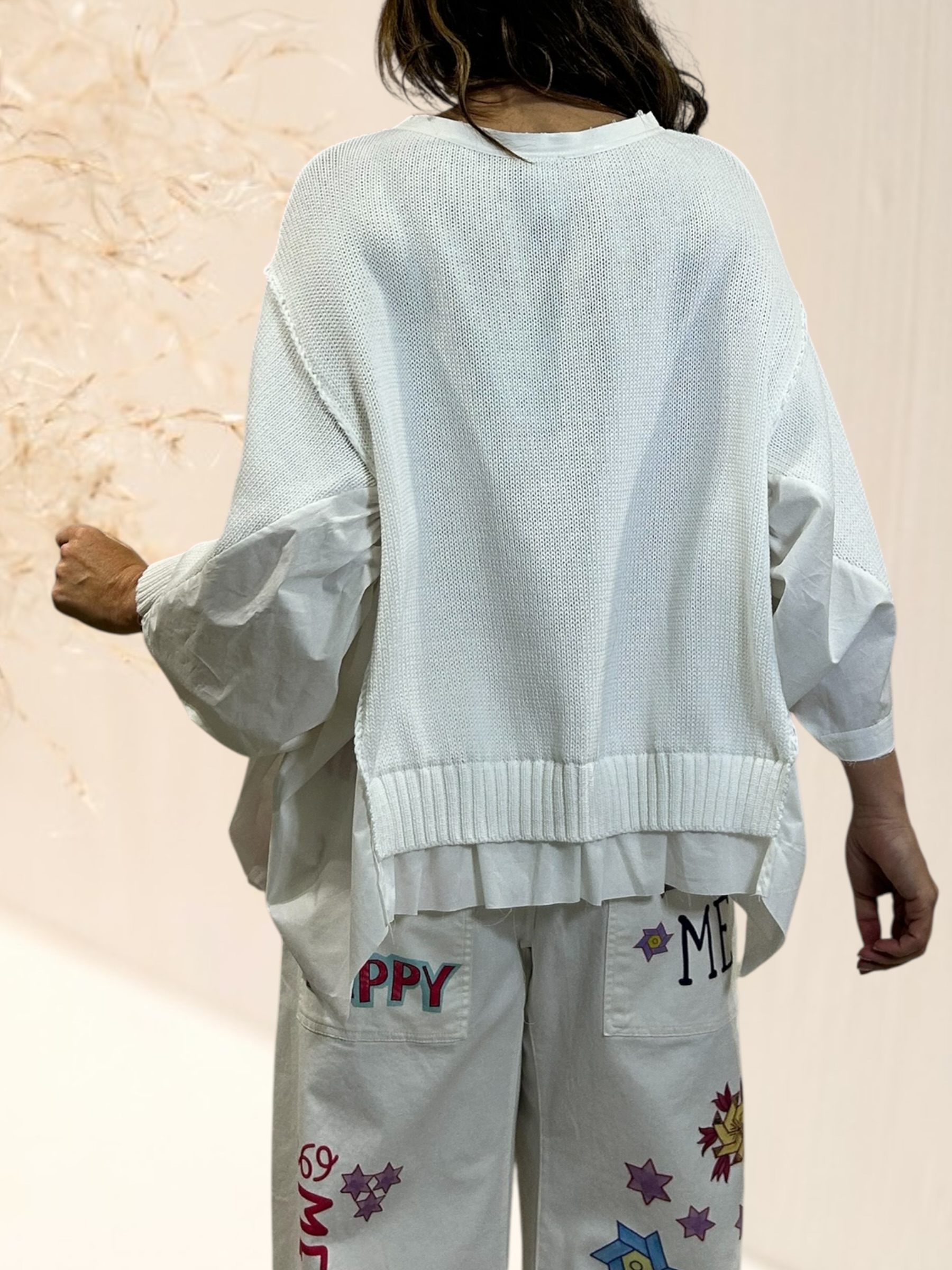 Pull oversize en maille coton et popeline sur le coté et manches avec design très original de notre créatrice italienne.